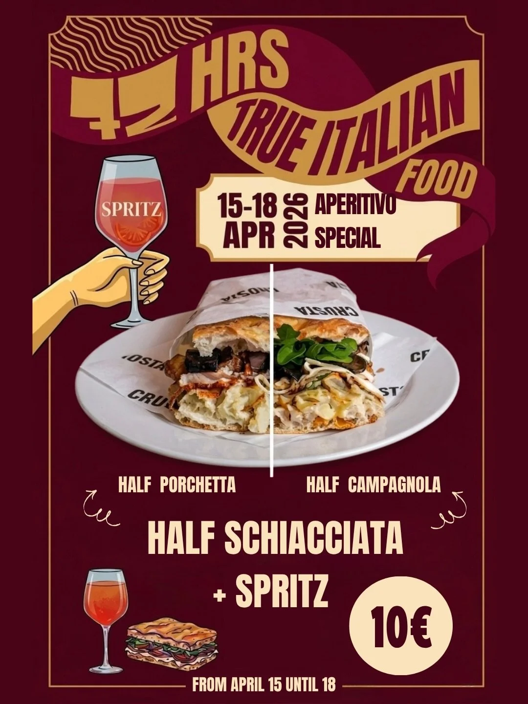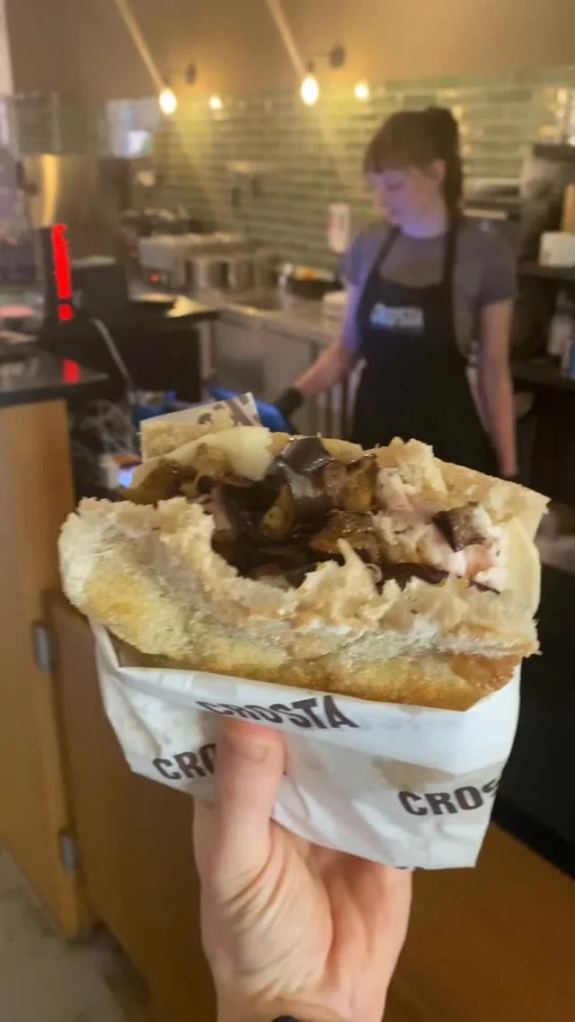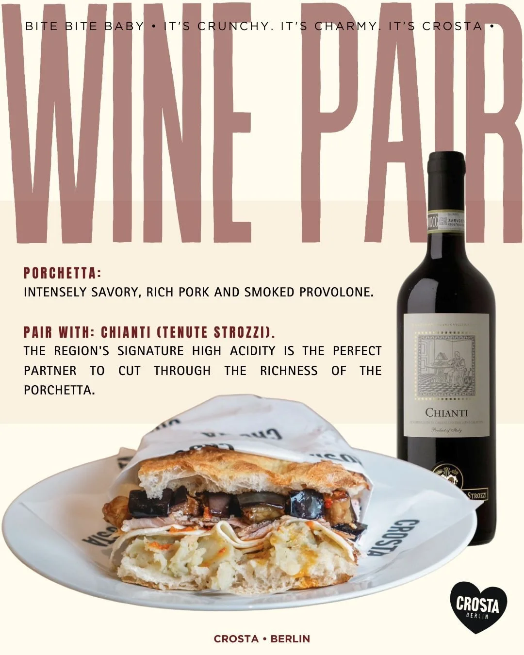 At Crosta, we bring this tradition to Berlin. Our schiacciata is made with a sourdough base, slowly fermented for lightness and flavour, then baked to golden perfection. It’s filled with the best Italian products — from creamy stracciatella and smoked provola to porchetta di Ariccia and mortadella from Bologna.